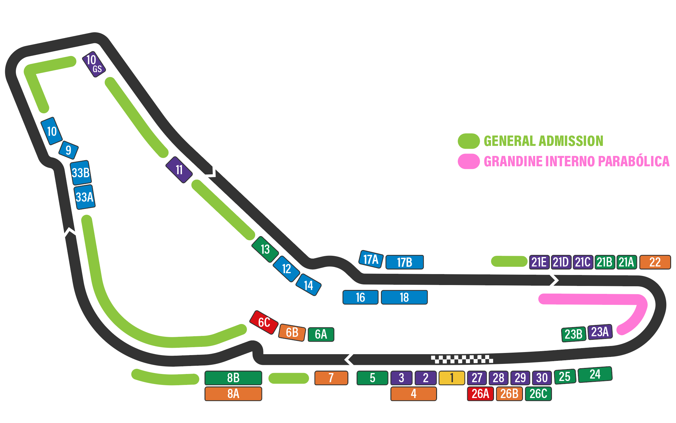 La tribuna está situada a la salida de la curva Curva Parabolica. Desde aquí, podrás ver los coches recorrer los últimos metros del circuito y tendrás una buena vista de la entrada al pit lane.